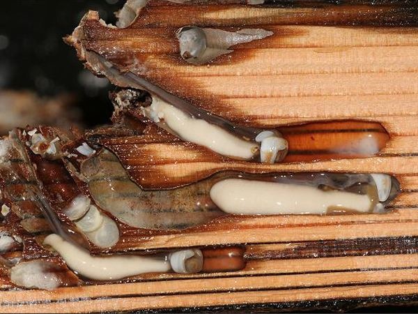 El teredo, gusano de la madera o broma es un género de criaturas marinas que a primera vista podría parecer un gusano. Pero se trata en realidad de un bivalvo que se ha especializado totalmente en alimentarse de madera. Cuando el teredo nada libre en forma de larva, busca una madera a la que fijarse y a continuación hace la metamorfosis. En su fase de adulto adopta la forma de gusano con dos pequeñas conchas en la parte anterior que no son más que las dos conchas típicas de un bivalvo pero altamente modificadas para perforar madera. Con sus nuevas conchas comienza a horadar la madera. Va construyendo un túnel cubierto de materia calcárea segregada por el cuerpo, dejando fuera el sifón para respirar. Y unas bacterias simbióticas que viven en su cuerpo generan celulasa que le permite digerir la celulosa de la madera perforada.